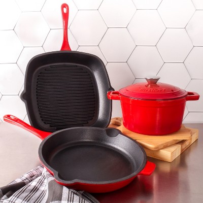 [This review was collected as part of a promotion.] These aren't high end quality pots and pans but for the price they are great. I really like the bright red, they make the kitchen pop when cooking on them. There are 2 pans of different size and 3 pots. They are all lined in a non stick material which makes it great for cooking things like eggs and chicken! They all come with lids and even a strainer/steamer. The pans allow for an even distribution of heat so no one side gets over cooked. Nice set!