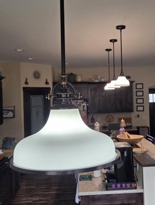[This review was collected as part of a promotion.] This pendant lived up to what I'd hoped for my client. She wanted something a bit "old school" but with a but of a modern twist. The shade is a lovely white and the metal trim at the bottom adds a nice decorative feature.