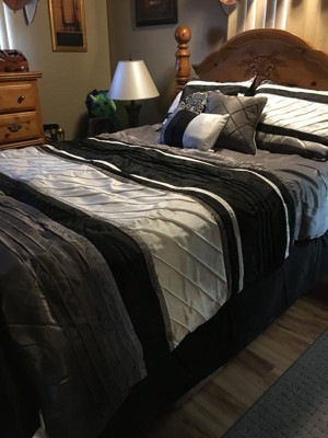 [This review was collected as part of a promotion.] I love the simple elegant design of this bed set. I use it on my queen size bed and it fits beautifully. It comes with a black bed skirt, two pillow shams with envelope opening in the back. And a nice medium weight comforter. There are also three different decorative cushions to finish it off. The set has a small pleated design on it, and I think it makes for a classy look. The material has a nice sheen to it, but it is not “slippery” and doesn’t slide off the bed. The colors would work in most bedrooms as they are neutral.. black, white and grey. It would work whether you prefer a masculine or feminine look.