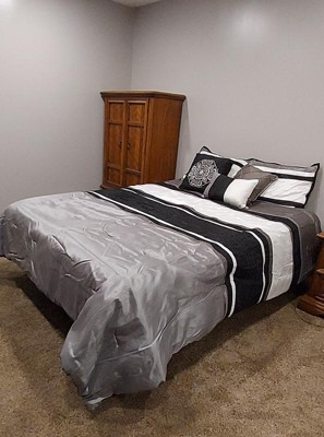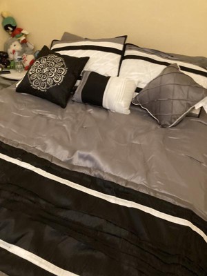 [This review was collected as part of a promotion.] This set is so cozy and welcoming I just love how thick, beautiful, and full the comforter is. It's so perfect for cold winter nights because the material it's made from is a warm yet comfortable fabric and it's not too thick but also thick enough to keep you warm through the night. The designs of everything in this set is just beautiful I love how great the grays, whites, and blacks go together to bring this look together. One of my most favorite things about this set has got to be the accent pillows I not only love how they bring the set together but I also love how they come in different sizes they are fun and great if you randomly need something to cuddle at night like I do. I love how the pillow cases in this set are designed because they are closed on both sides to keep the pillow from falling out the sides. The only bad thing I have found about this set is some of the threads have come up from the comforter after just one night of sleeping with it, but that might just be a one time thing and not actually a design flaw. I would recommend this set to anyone looking to spruce up their bedroom because the design on every piece of this set is fun and would match a number of bedrooms. The colors are great for a neutral room because they are warm and welcoming and really make the bed stand out. The quality and value that this set has to offer is great and I can definitely see myself using this set for years to come.