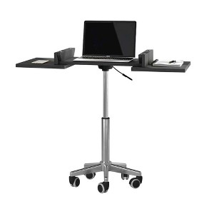 The Furnifact gray folding desk is a compact, mobile workstation designed for flexible living and working environments. Crafted from heavy-duty MDF panels with a graphite finish and paired with a powder-coated metal frame, this portable laptop desk delivers strength and style. Its chromed steel frame allows smooth height adjustment between 25 to 35 inches, making it ideal as a mobile standing desk or rolling laptop stand. The desk features two fold-out side panels that extend the workspace by 14 inches when opened, offering adaptability for changing needs. Designed to accommodate laptops up to 16.5 inches wide, this mobile desk workstation holds up to 22 lbs. on the main platform and 5.5 lbs. on each folding panel, ensuring a stable work surface. The compact size and integrated casters make it an excellent choice for small spaces such as dorms, apartments, or home offices. Whether used as a rolling computer desk, portable desk for laptop, or compact computer desk, it transitions smoothly from one task to the next with minimal effort. This folding desk functions equally well as a standup desk or rolling side table, thanks to its ease of movement and durable structure. Ideal for those working from home, teaching online, or managing digital tasks in tight quarters, it is a thoughtful piece of small space furniture. No tools or lengthy setup are required—simply unfold and adjust to your desired height. The product will be delivered in its original manufacturer packaging.