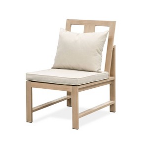 Introducing our set of 2-Modern Outdoor Dining Armless Chairs, your next step towards achieving an impeccable outdoor living space. Boasting high-quality construction and contemporary aesthetics, these chairs elevate any patio or garden setting. Constructed with a sturdy aluminum frame, these armless chairs offer dependable durability perfect for outdoor use. The frame is skillfully crafted with a wood-inspired textured metal finish, effortlessly merging the rustic warmth of wood with the long-lasting qualities of metal. Each chair is finished in a refined beige hue, which perfectly complements the beige polyspun fabric cushions, adding a touch of elegance to your outdoor decor. These cushions are not just stylish, but also functional. Designed for easy maintenance, the cushions are removable and come with washable covers, ensuring that your chairs will look new season after season. The modern design is enhanced by the timeless slat-back style, offering both visual appeal and back support for an incomparably comfortable experience. Experience outdoor dining at its finest with these armless dining chairs. Designed for the modern homeowner who doesn't compromise on comfort or style, these chairs offer a blend of durability, aesthetics, and easy maintenance. Ideal for any outdoor occasion, from casual family dinners to upscale garden parties, this set provides a versatile seating solution.