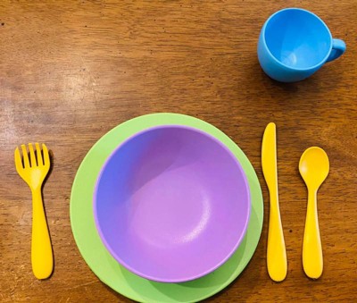 [This review was collected as part of a promotion.] I got these dishes for my granddaughter, She loves to have tea parties and stuff with her dolls and friends. These dishes are very durable. They are thick and sturdy, So they can take a beating. They don't seem like they will break at all. This is a 24 piece set, you get 4 Cups, 4 Plates, 4 Bowls, 4 Utensil Sets, Fork, Knife, Spoon. So no worries about your little one dropping her/his plate or cup. I got to say these are a decent size for toddlers. They have enough room for their food and are the perfect size for toddler's hands. She uses them to eat off of and to play portend with her dolls. I love that these are recycled from milk jugs. There is no BPA, phthalates or PVC in this set of dishes which is a big plus. Overall we love this set of dishes. The bold colors are pretty. My granddaughter loves the idea of having her own set of dishes.