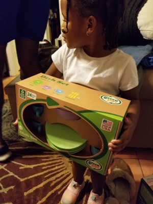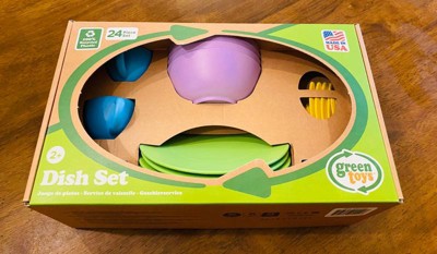 [This review was collected as part of a promotion.] Green Toys Dish Set is a fun 24 piece set that has 4 plates, 4 bowls, 4 cups and 4 sets of utensils. It is dishwasher safe for safe easy cleaning and it's made from 100% recycled plastic of which is primarily milk jugs. This beautifully colored set provides great imagination and hours of fun play. My granddaughter loves it.