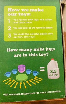 This Dish Set is not your typical toy. We transformed recycled milk jugs into this imaginative plaything! Manufactured and assembled in the USA, it’s made from 100 percent post-consumer recycled plastic milk jugs (HDPE #2 plastic). With no external coatings, paints, or dyes, this super-safe, durable toy is good for the earth and safe and fun for little ones. It’s also packaged in recycled and recyclable materials with no plastic films or twist ties, and printed with eco-friendly ink.