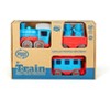 All aboard! The Green Toys Blue/Red Train is pulling out of the station! This brightly colored steam engine pulls two additional cars that link together to form a long train, or easily unhook for stand-alone play. The open wagon is perfect for hauling all kinds of sustainable cargo, while the caboose features a spacious interior and removable roof. Two conductor bear figures are included with the set. With no metal axles or external coatings, the Green Toys Train is safe and versatile for both indoor and outdoor play and is dishwasher safe for easy cleaning.