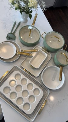 After years of mismatched cookware and bakeware, it was time for an upgrade! This matching set was gifted to us and has made our every day cooking and baking so much more sophisticated. Everything cooks perfectly, slides off effortlessly and cleanup is a breeze. This mama is very happy!