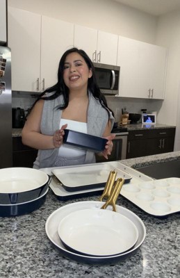 [This review was collected as part of a promotion.] This GreenPan reserve bakeware Seven-Piece set in sage color is now my favorite pans and I'm so glad I got to try them through influenster, I actually threw away all my metal non-stick baking pans because they get absolutely ruined after cooking but as you can see in one of my pictures, I cooked a salmon fillet with the skin on and nothing stuck to the pan, not even the oil stuck to the pan or ruined the pan like it does using the metal non-stick pans that you have to scrub and scrub and scrub and you still can't get the grease spots off, these pans are absolutely amazing!!! They are a little on the heavier side but I love them. They are extremely good quality and cleanup was a breeze since nothing stuck to the pan, I'm just literally in shock because whenever I cook I use a little bit of olive oil on my baking sheets and usually the salmon skin will stick to the pan and I have to scrub it off but not with these pans, You get the cupcake pan, the meatloaf pan, a small baking sheet and a cookie sheet, two round cake pans and a cooling rack... They are non-stick ceramic and toxin-free and I absolutely love them!