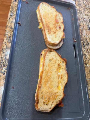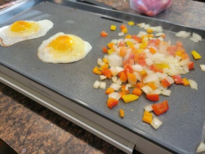 [This review was collected as part of a promotion.] I really enjoy this griddle. It truly is non stick. Everything slips around. The top material looks and feels a lot like plastic to me but I know it’s not. There is a catch tray for food as well as a warming tray. The legs seem to be different sizes so it tilts slightly to the back to help with liquids going into the tray which is very convenient. It heats up really fast. Impressively fast actually within a minute. There’s 3 modes low medium and high. The ok mode heats up as well and would probably work best as a keep warm, it didn’t really start to cool until I went low/medium. Once it did start cooking it cooked fairly evenly. The only thing I don’t care for is all the plastic underneath. Makes washing not as easy, there isn’t a good place to grip and hold while washing. Also water gets in there and there’s not way to dry it so air dry it is. Other than that it’s overall an excellent griddle. I love cooking on it.