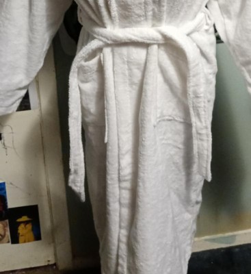 This bathrobe is great. It feels like a terry material but it’s long and absorbs water pretty good. It’s great size and has pockets which is a plus. I like that it’s embroidered on the side. It washes pretty well and stays the same form. I would recommend this to people that are getting married as a gift.