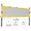 - Poles and Stakes: The badminton volleyball set with net has two three-piece heavy-duty black powder coated steel poles that are 1.25" in diameter and 8' high, they have double-braided guide ropes with four metal stakes; strong support steel poles and guide ropes will ensure the net won't shake while you are playing your game; 180 feet long and 1 inch wide standard site boundary tape for high visibility, makes your game look more formal and fair