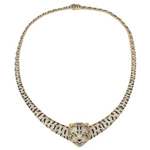 An Avante-Garde necklace covered with cubic zirconia and plated with 14K gold. The center of the necklace features leaopard's face with emerald green eyes. The necklace replicates leopard print with crystals and black stones. This statement necklace closes with a discrete lock snap that blends into the chain links. It's a showcase of masterful craftsmanship that will grab attention everywhere you go.