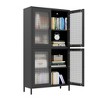 Introducing this freestanding black metal storage cabinet featuring 4 begonia flower embossed tempered glass doors and 4 shelves, a versatile and elegant addition perfect for home offices, living rooms, kitchens and hallways. Boasting a timeless 2-pair double-door design that never fades from fashion, it blends nostalgic charm with modern practicality. The cabinet¡¯s cold-rolled steel frame is finished with eco-friendly powder coating for long-lasting durability and environmental friendliness, while its 4mm thick reinforced tempered glass doors are shatter-resistant, non-yellowing and far sturdier than plastic, board or acrylic materials. The unique combination of black frame and begonia pattern glass infuses any space with a classic, sophisticated vibe. Thoughtful details elevate user experience: adjustable shelves let you customize storage space for items of different sizes, raised legs prevent dirt accumulation and allow sweeping robots to clean underneath, and anti-tipping accessories ensure safe use in families with children or pets. Measuring W31.5" x D12.6" x H59", this moderately sized cabinet fits seamlessly into various scenarios, serving as a study bookcase, office file cabinet, kitchenware storage unit, dining room side cabinet or hallway display cabinet as needed. Plus, it comes with a clear installation manual for easy assembly, and our dedicated after-sales team is always on hand to provide prompt support whenever you encounter any issues.