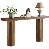 Gulches 63" console table (Brown) embodies farmhouse chic with bold designs, sleek lines, and minimalism. Unique cylindrical legs boost visual appeal and sturdiness. 63" wide rectangular top fits favorite decor; crafted from high-quality MDF (durable, unique grain). Easy assembly; slim lengthy design suits entryways, hallways, behind sofas, or living rooms.