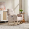 Soft beige teddy fleece rocking chair with gentle gliding motion. High density sponge padding and ergonomic backrest offer long sitting comfort. Sturdy plywood and rubberwood frame supports 300lbs with side pocket for essentials. Multi occasion use fits home decor.