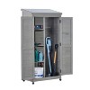 This tall vertical outdoor wooden storage shed with a metal top is an ideal storage solution for backyard, garden, patio and lawn spaces. With its spacious 33"L x 18.5"W x 68"H interior, it easily accommodates tools of all sizes and shapes, while the sloping metal roof ensures fast rainwater drainage to avoid water buildup. It comes with 3 removable shelves that can be customized to fit your storage needs, creating flexible compartments for different items. Crafted from premium cedar wood with a protective water-based gray coating, this shed features a patented farmhouse design that combines classic style with weather resistance, standing up to rain, sunlight and other outdoor elements. Plus, most small parts are pre-assembled, making the assembly process quick and easy in just about 20 minutes. Suitable as a utility tool closet, garden shed or pool supplies storage, it meets all your outdoor organization needs for gardens, patios, porches and garages.