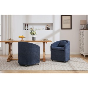 This single blue chenille dining armchair blends luxurious comfort with practical functionality, making it a stylish addition to your dining room and other indoor spaces. Upholstered in soft, premium chenille fabric and filled with high-density foam, it features a supportive back cushion that aligns with ergonomic principles, reducing back fatigue during long meals or gatherings. Built with a robust combination of wooden and metal frame, the chair boasts a 250 LBS weight capacity, ensuring reliable stability for daily use. The 360¡ã swivel universal wheels enable effortless rotation and smooth movement, allowing you to glide in and out of your seat with ease. Measuring 22.05"D¡Á24.41"W¡Á29.92"H and weighing only 21.12 LBS, its compact size lets you tuck it neatly under a table when not in use, saving valuable floor space. Assembly is simple¡ªtwo people can complete the setup in just 30 minutes, and maintenance is hassle-free: spot clean any spills or stains with a soft, dry cloth to keep the chair looking fresh. Whether used as a dining seat or a cozy accent chair, this blue chenille armchair combines style and utility to elevate your home interior.