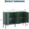 • Retro-modern style: 59″ forest-green buffet features paneled doors and carved handles for a mid-century look.