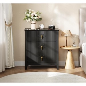 This modern chic chest of drawers features elegant fluted panels, a thick natural wood grain tabletop, and luxurious gold-tone metal handles that add a distinctive, upscale touch. Measuring 15.7" D x 27.5" W x 31.5" H, it offers three spacious drawers for versatile storage of clothes, cosmetics, and personal items. Built with a solid one-piece supporting foot and adjustable center foot, it provides superior stability and load capacity. Crafted from premium MDF with a scratch- and water-resistant top, the dresser includes silent ball-bearing drawer slides, a dual anti-drop design, and an anti-tip kit for safety. Suitable for multiple rooms, it fits seamlessly as a bedroom organizer, entryway catch-all, or living room TV stand. Easy to assemble with clear instructions and support available.