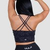 DESIGN: Sports bra features scoop neckline with a unique cross back style. Medium support. It comes with removable pads. Color is black with camo-like pattern and WULF logo.