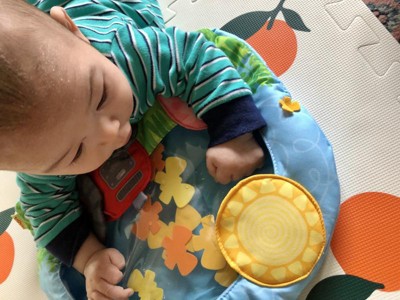 [This review was collected as part of a promotion.] This has been my lil guys favorite activity for tummy time. I love the fabric casing keeps it soft and gives no harsh edges, the detachable farmer and crinkly sun are great touches as well. Having looked at over similar mats I've been really impressed by the quality and extra design details which make it more appropriate for infants. The fabric casing separates for cleaning and the valve for filling at the back is really secure and seems unlikely to leak. Our baby loves to lie and see the butterflies more about inside!