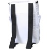 This exclusive backpack is designed after the Primary Life Support Subsystem that astronauts wear. The square backpack has a zippered top flap for the main compartment, a touch strip secured side pocket on each side, and two zippered pockets in the front. The exterior has an American flag and a NASA decal. The straps are adjustable.