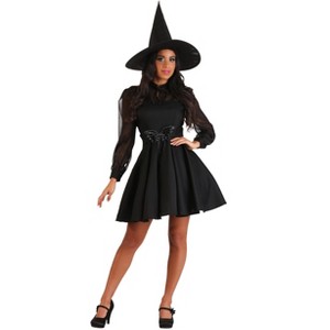 You'll cast a spell over everyone you meet this Halloween when you fly into the night on your broom wearing the Women's Spellbinding Sweetie Costume. You'll look wicked and classy when you wear the long-sleeve back dress with mesh sleeves and a bat embellishment at the center. This costume also comes with a pointy wide-brim hat. The skater-style dress looks great on all body types!