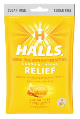 HALLS Relief Honey Lemon Sugar Free Cough Drops are ready for whatever life throws, or coughs, your way. With 7.6 mg of menthol per drop, these honey lemon cough drops relieve coughs, soothe sore throats and cool nasal passages to relieve your worst symptoms. The enjoyable and refreshing honey lemon flavor is sugar free to fit a variety of lifestyles. Whether you're using HALLS cough drops for sore throat relief, cough relief or as an oral anesthetic, simply dissolve one drop in your mouth slowly, and repeat every two hours as needed. HALLS Relief menthol cough drops are formulated for adults and children five years and older. Each economy package contains 70 drops and is resealable to easily toss in your bag for convenient access when symptoms strike.