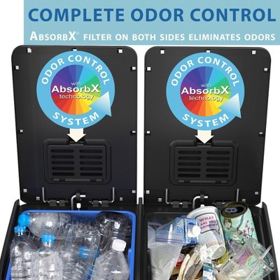 Smart Recycle & Trash Solution – Blue side for recycling, black side for trash. Quick and easy way to separate trash and recyclablesOdor Control System – Features dual AbsorbX odor filters, one for each side. AbsorbX filter absorbs & neutralizes odors the natural way, for a fresh & clean smelling home. First 2 filters included!Gentle & Silent Lid Close – Durable, ergonomic pedal requires minimal force to open; easy to replace air damper for years of like-new performanceSophisticated & Stylish – Elegant, fingerprint-proof and smudge-resistant brushed stainless steel is easy to clean and complements any décorEasy & Mess-Free Emptying – Two separate, color-coded 8 Gallon removable inner buckets with handles make it easy to take out the garbage and recyclingDurable & Ergonomic – Pedals require minimal force to open; easy to replace air damper for years of like-new performanceRemovable Inner Buckets – Make taking out the trash easy and mess-free
