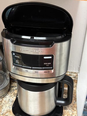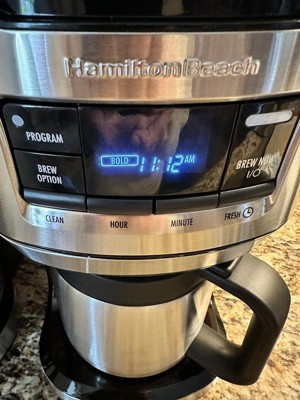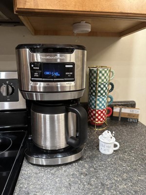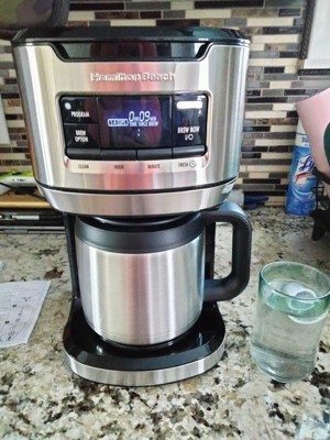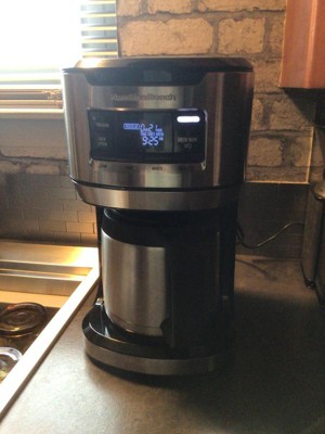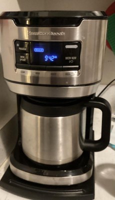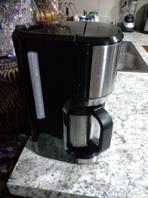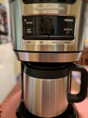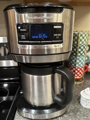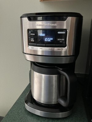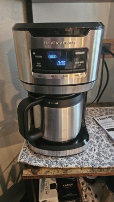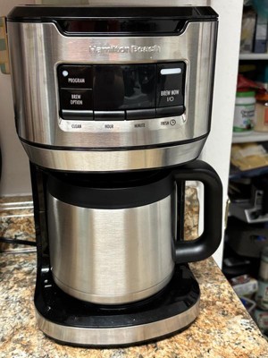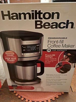 [This review was collected as part of a promotion.] The Hamilton Beach front-fill coffee maker is not only stylish in black and stainless steel but is also an amazing coffee maker. It has a 12 cup capacity with an extra large thermal carafe that keeps your coffee hot and fresh longer. You have 3 brew options and its also programmable so you can wake up to a delicious cup of coffee. I really like the auto pause feature that allows you to pour a cup before brewing ends and it comes with a reuseable coffee filter and includes a water filter as well. I'm extremely pleased with this product.