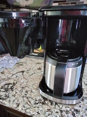 [This review was collected as part of a promotion.] I got my Front-Fill 12 Cup Programmable Coffee Maker with Thermal Carafe Stainless Steel Accents about 14 days ago. The coffee basket comes with removable basket so you don’t need filter papers. Ifyou choose not to use this number 4 cone filter papers will work. There is an option to make 12 cups or 4 cups. Also you can program it to make coffee at a designated time after setting your time. There is immediate auto shutoff. The thermal carafe keeps the coffee hot and fresh longer. I found this coffee maker is easy to use and looks great. It is good to go back a few hours later and still get hot coffee.