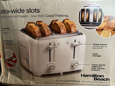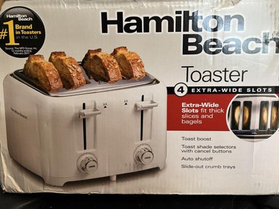 [This review was collected as part of a promotion.] I really like the Hamilton Beach 4 Slice Toaster with Extra-Wide Slots. The toaster is fairly large, but does not take up too much space. What I really like about the toaster is how the controls and knobs are on the front of the toaster, not on the side. The extra wide slots are perfect for toasting bagels, or thick slices of bread. The crumb tray is located below, and easy to remove and clean. I found that toast for me works best on the number two to three setting. I found that anything higher than that tends to burn the toast. The toast boost lever helps to push the toast up high after it's done, which is nice, and I really like the simple cancel buttons. All in all, a very nice toaster with great features.