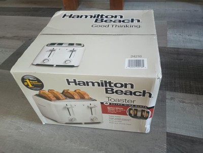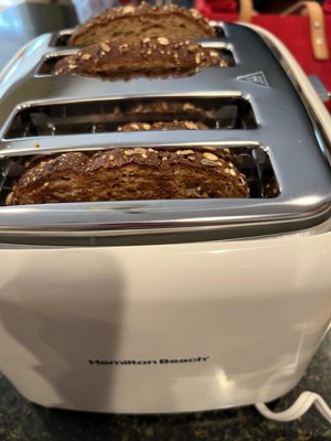 [This review was collected as part of a promotion.] We love this wonderful Hamilton Beach 4 Slice Toaster with Extra-Wide Slots. The design is beautiful. It really brings life to my counter top. Quality is amazing. I cannot say enough about it. This toaster fits larger bread slices which to me is the best feature. My bread comes out toasted to perfection. It does not burn my toast at all. The 4 slots are so much more convenient than 2. My family enjoys using it daily. I absolutely recommend it.