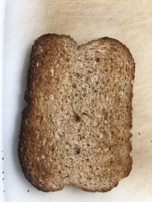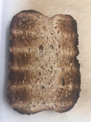 Photos show both sides of a slice of bread - by time the top is toasted properly, the under side is burnt. Also, the range on the dial for toasting is so tiny that you can't set it for what you want -- just have watch and take it out before (you hope) the bottom burns. Basically useless for toasting bread, which is what we use a toaster oven for most often.