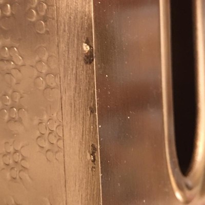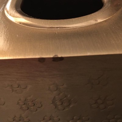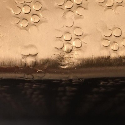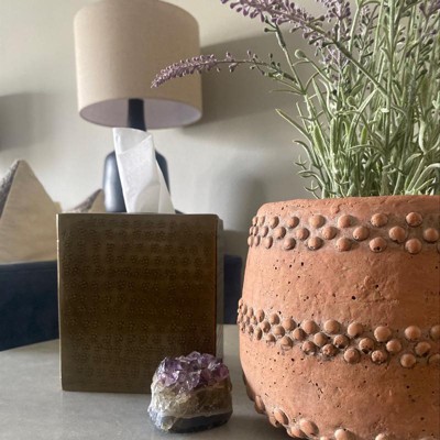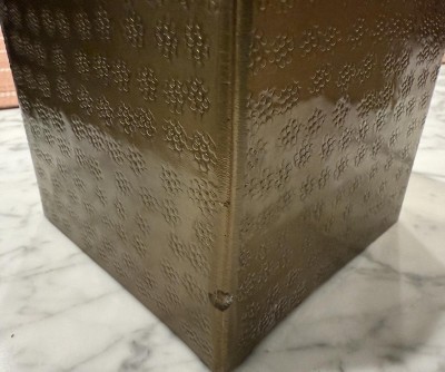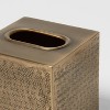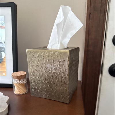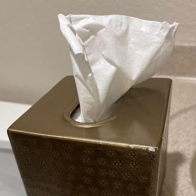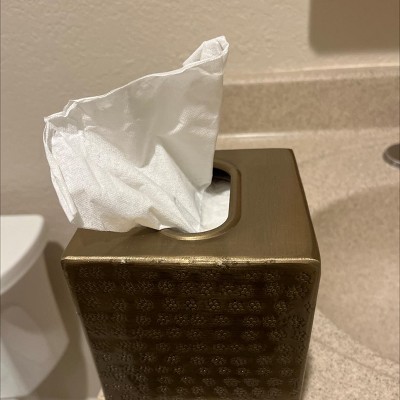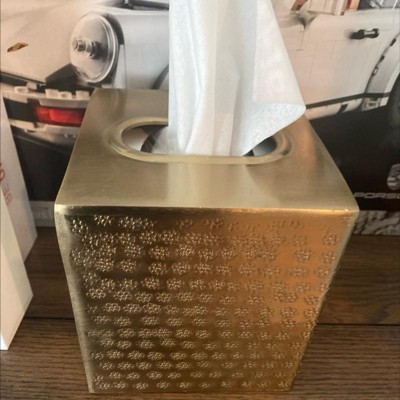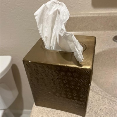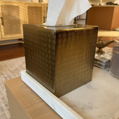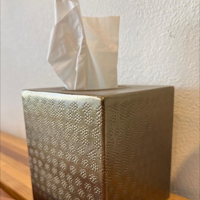 A: The tissue cover features a hammered design for a sophisticated and antique-inspired look.