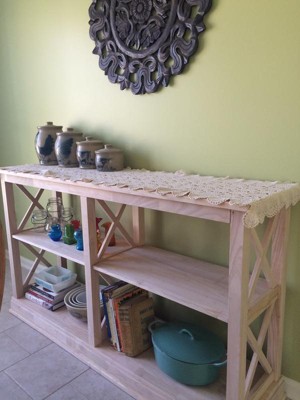 This piece is being used as a console table in our family room and I have gotten numerous compliments on it. Once stained, it looks very high end in person! I was able to put this together on my own in about 25 minutes. It is a solid, sturdy piece and took the stain I used with no problems. I liked this piece so much, I also ordered the coffee table!