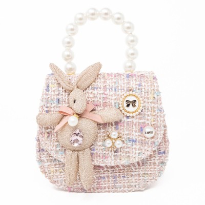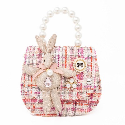 Soft pastel tweed meets plush sparkle in this dreamy mini handbag, featuring a glittery bunny charm, pearl top handle, and delicate embellishments. The flap opens to a blush-pink interior with a secure magnetic closure and includes a detachable gold chain shoulder strap for two-way styling. Perfect for little fashionistas or a special gift!