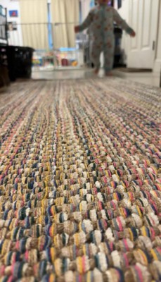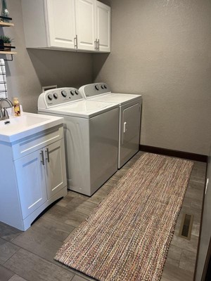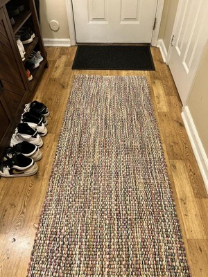 I absolutely love this woven rug in my entry way. It’s such adds such a pop of color with its threading and looks very nice. I also enjoy the colors in this runner as my kids and husband are always in and out, dirt tracking and bringing in leaves and whatever other nature. This does not show any dirt or stains. Which is something they usually drives me crazy in runners. It’s woven tightly so you shouldn’t have any pulls in the fabric, I feel this will hold up for quite a while. When it’s rained and the kids take off their boots the rug only stays wet for a short time so I feel it dries very quickly. The only thing you’ll need to be sure of, is getting a grip for under the runner. If you’re putting this on a solid smooth floor, it will slip. Otherwise, it’s perfect!