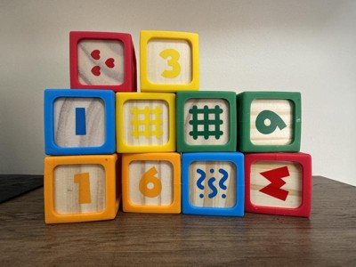 - Building set comes with 10 brightly colored wooden blocks with soft silicone edges.