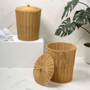 This wastebasket set combines the timeless charm of woven design with the durability of modern materials. Crafted from polypropylene resin over a sturdy metal frame, each piece is lightweight, resilient, and easy to maintain. The rounded silhouette with a fitted lid creates a neat, finished look while keeping contents discreetly contained.