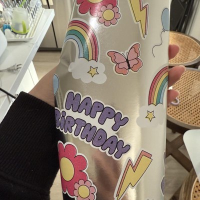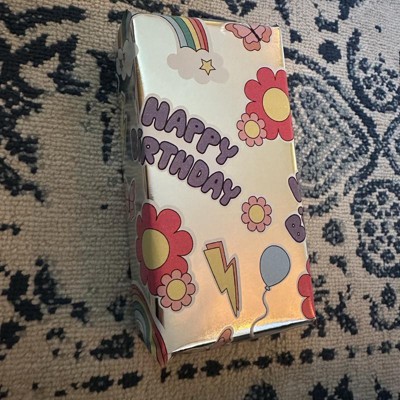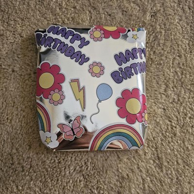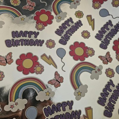 A: The design theme includes flowers, rainbows, balloons, and 'Happy Birthday' texts.