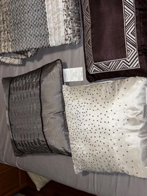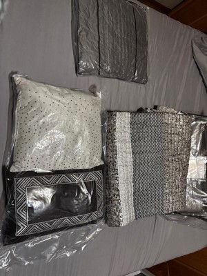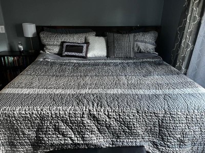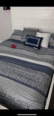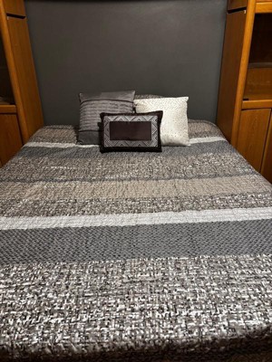 [This review was collected as part of a promotion.] The bedding set is absolutely beautiful. The set includes 3 decorative pillows, 2 pillow cases and a quilt coverlet. The coverlet is reversible which I love because it allows for a different look. One side of the coverlet has a gray metallic design and the other side is a solid gray color. The set is great quality and the coverlet is a bit heavy weight which is great for cold nights.