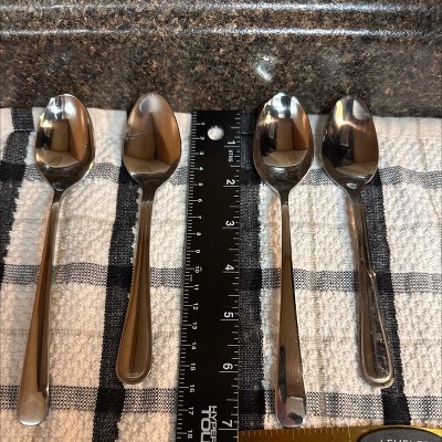 I love these spoons. I bought 12 in store because I was sick of having all our smaller spoons being used up so quickly so I decided to get rid of our bigger tablespoons and replace them with these because we never use the bigger spoons. (They are too big to eat with and too small to serve with or do anything else with so they just sit there!) and so glad I did. They are a great weight. They aren't flimsy. We had a bunch of other spoons that would bend very easily and my husband disliked them. These are good quality and have weight to them. They are smooth and simple. Very stainless steel finish and all around happy with our purchase.