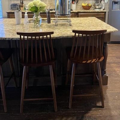 Update your kitchen area with the Harwich High-Back Windsor counter stool from Threshold™. Sporting a high, slanted, slatted back for an open and airy feel, the decorative wooden stool has a contoured seat for additional comfort and splayed legs for traditional flair. This wood-finish stool is a perfect match for your home and makes for a comfy seating spot in your kitchen or dining area.