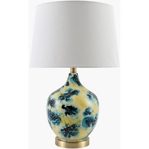 Brand: Hauteloom < br / > Collection: Mixquiapan < br / > Colors: Blue, Metallic - Brass, White < br / > Style: Traditional < br / > Size: 24"H x 15"W x 15"D < br / > Shape: Circular < br / > Material: Base: Iron; Body: Glass; Finial: Iron; Shade (Inside): Linen; Shade (Outside): Linen < br / > Roomtype: Living Room, Bedroom < br / > Made in: China < br / >