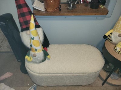 Love love love this little bench! Holds a few of my throw blankets, sturdy enough to sit on comfortably, perfect boucle/sherpa texture and I love the neutral wooden feet. Got on sale for $70 so such a bargain also! Came fully assembled, just had to screw in the round wooden feet.