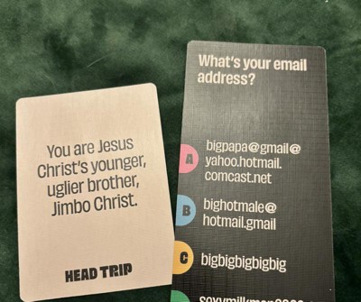 The game doesn’t make sense. The Head Trip cards and the question cards don’t match. I had high hopes, but this game is being returned.