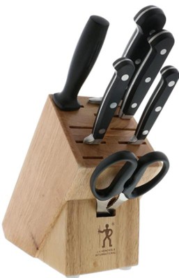 [This review was collected as part of a promotion.] I bought this set because it is the size, variety, and quality level I was looking for. Something between a full chef quality set and something where the blades are heavier instead of being as sharp or sharpen-able. The corners of the handles are squared off instead of rounded like in other sets from Henckels, and even after buying the 7" bread knife, which fits just fine, thank you (!), I have three more open slots for other knives if I wish, like a boning and fillet knife, for instance. Also, the packaging when they ship it to you is done rather well; just be careful when unpacking the knives. They come all together in one small box wrapped up in tissue paper.