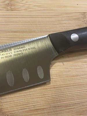 Pretty nice and solid looking knife block set. One of the knives had a bit of the plastic melted at the base, but that’s more of an aesthetic issue than a functional issue. The grantons on the santoku knife look uneven and sort of jagged, but are deep enough to still be functional. Generally good budget knife set.