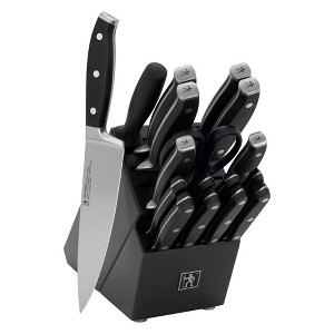 The Henckels International Forged Premio 18-pc Knife Block Set has a knife to handle every kitchen task. Fabricated from high-quality German stainless steel, the fine-edge blades are perfect for precision cuts. The all-rounder 8" Chef's Knife is ideal for chopping herbs and dicing onions while the 5" Serrated Utility Knife cleanly slices through tomatoes. Perfectly peel apples with the small 3" Paring Knife.